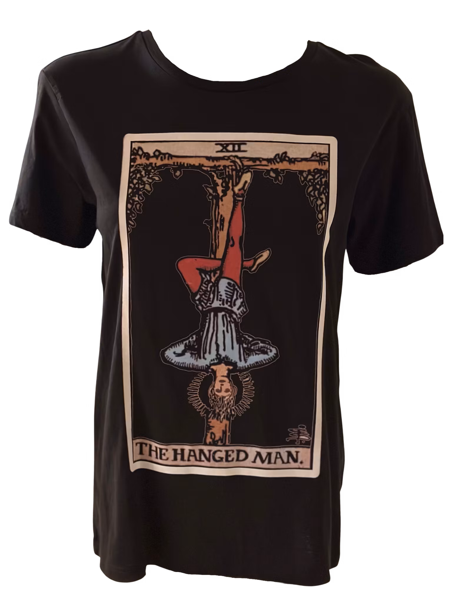 Black T-shirt with print of The Hanged Man from the Rider Tarot card deck.