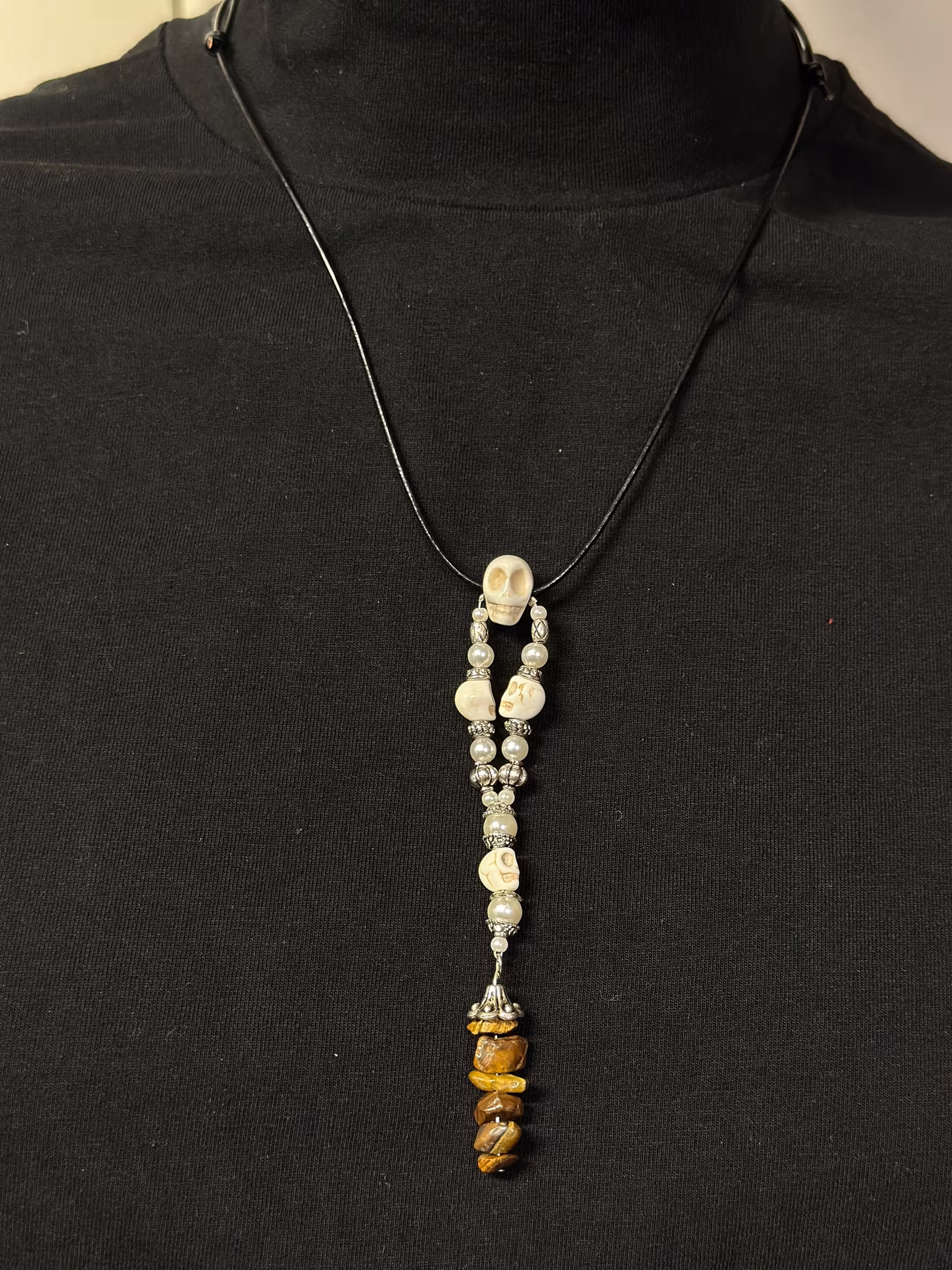The No. 7b necklace features a leather chain, adorned with several nuggets of Tiger Eye gemstones. Known for its protective and grounding properties, the Tiger Eye gemstone is not just an accessory; it's a symbol of strength and resilience. Complementing the pendant are beads of dyed synthetic turquoise, synthetic pearls, and a variety of plastic and metal beads, each chosen for their unique texture and color.